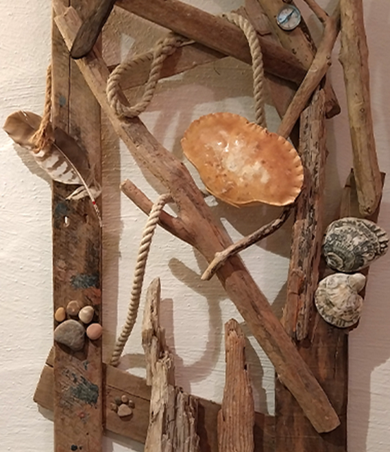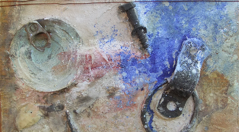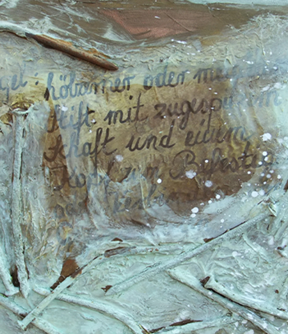 Eine Technik verschiedener flächiger Elemente, wie Papier, Pappe, Zeitungsausschnitte oder Stoffen, die auf einem Bildträger angeordnet werden. Darüberhinaus kann die Collage mit Krackelierlack überarbeitet werden.